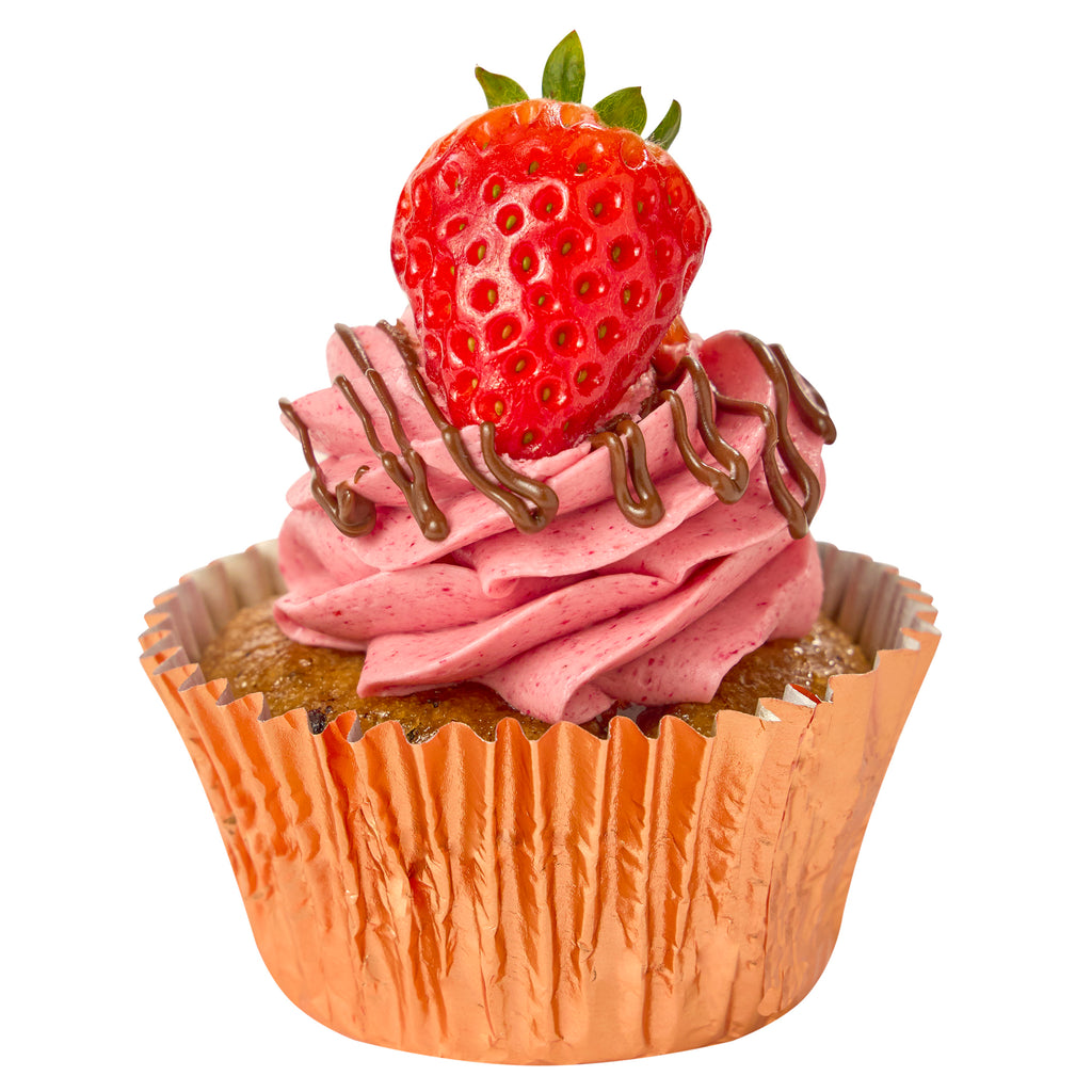 DESCRIPTION: Childhood classic flavours are reimagined with a chocolate chip sponge filled with plant-based Nutella® and strawberry purée. Topped with a vegan-friendly strawberry frosting, drizzled with plant-based Nutella® and garnished with a fresh strawberry. Vegan and Gluten-friendly. Please note that all our products are handmade and slight variations in appearance may occur.